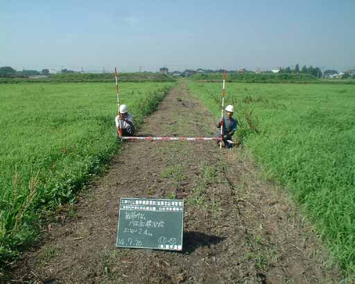 トラクターでの耕耘と肩掛式刈払機での仕上げ、そして刈払面積の測定。